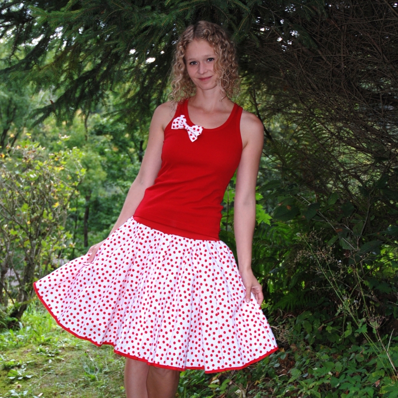 Sukně v retro stylu je ušitá z puntíkované bavlněné látky - bílý podklad a červené puntíky o velikosti 1 cm. Je kolová a má červený pružný pasový límec, který se dobře přizpůsobí a je velmi pohodlný. Spodní okraj je červeně olemovaný.