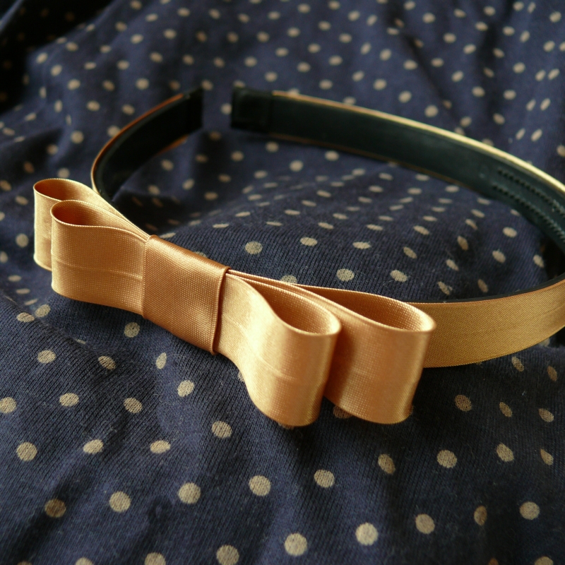 Medově zlatá čelenka do vlasů má mašli velkou cca 7,5 cm. Šířka čelenky je cca 1,2 cm.