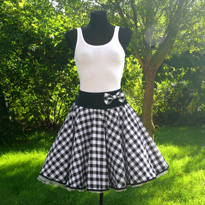Sukně je ušitá z bavlněné látky s černobílým kostkovaným vzorem. Je kolová a má černý pružný pasový límec, který se dobře přizpůsobí a je velmi pohodlný. Spodní okraj je černě olemovaný.