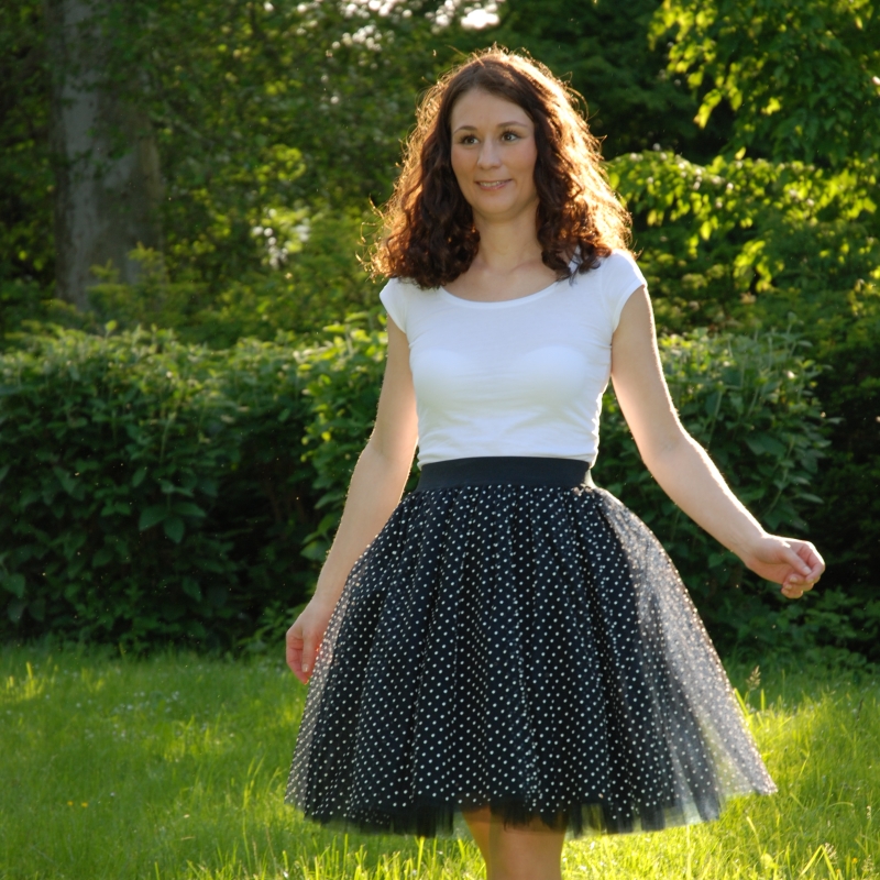 Sukně je ušitá z mnoha vrstev nařaseného černého tylu, horní vrstva tylu je bílá - puntíkovaná. Sukně je podšitá černou látkou, která však pod vrstvou tylu není vůbec patrná, takže sukně vytváří dojem, jakoby byla celá jen z lehounkého tylu. Sukně je pečlivě ušitá, vrstvu po vrstvě. Důraz kladu na zapošití každé nitky a kvalitně provedenou práci. V žádném případě se nejedná jen o navázané kusy tylu na gumu!