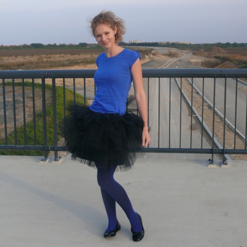Sukně je ušitá z několika vrstev nařaseného černého tylu, podšitá je černou látkou. Sukně je pečlivě ušitá, vrstvu po vrstvě. Důraz kladu na zapošití každé nitky a kvalitně provedenou práci. V žádném případě se nejedná jen o navázané kusy tylu na gumu!