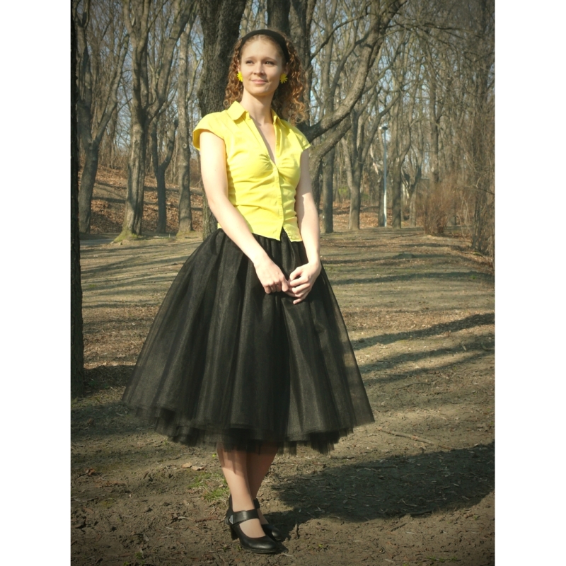 Sukně je ušitá z mnoha vrstev nařaseného černého tylu, podšitá je černou látkou, která však pod vrstvou tylu není vůbec patrná, takže sukně vytváří dojem, jakoby byla celá jen z lehounkého tylu. Sukně je pečlivě ušitá, vrstvu po vrstvě. Důraz kladu na zapošití každé nitky a kvalitně provedenou práci. V žádném případě se nejedná jen o navázané kusy tylu na gumu!