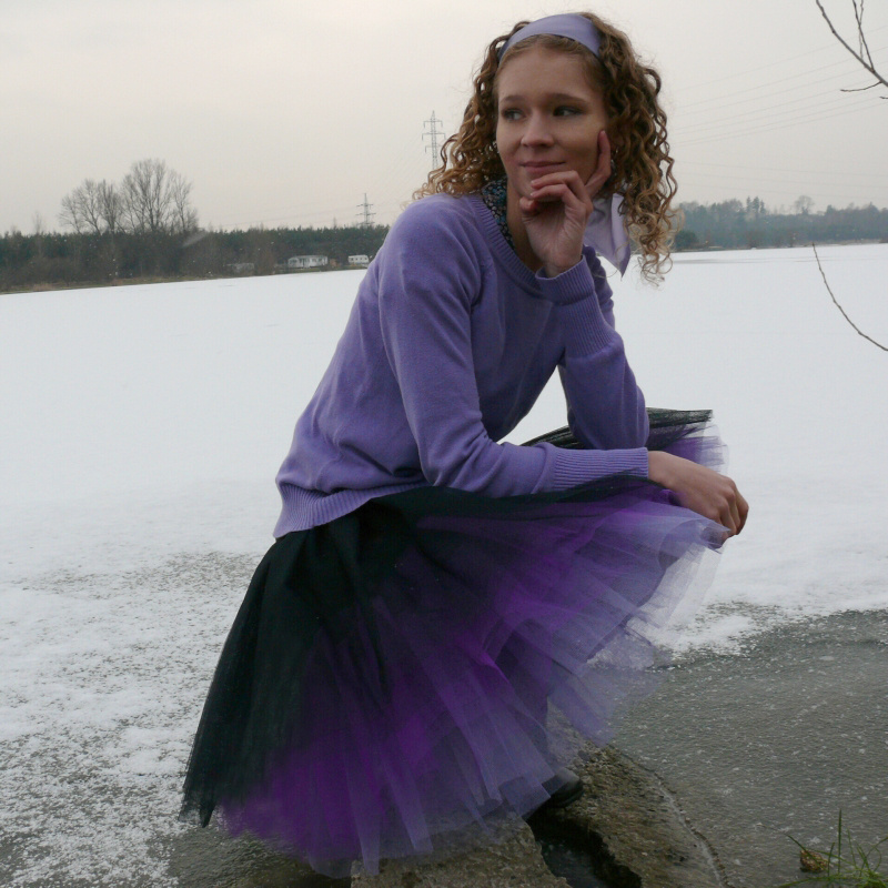 Sukně je ušitá z několika vrstev nařaseného tylu ve čtyřech barvách (černá, dva odstíny fialové, bílá), podšitá je černou látkou, která však pod vrstvou tylu není téměř patrná, takže sukně vytváří dojem, jakoby byla celá jen z lehounkého tylu. Sukně je pečlivě ušitá, vrstvu po vrstvě. Důraz kladu na zapošití každé nitky a kvalitně provedenou práci. V žádném případě se nejedná jen o navázané kusy tylu na gumu!