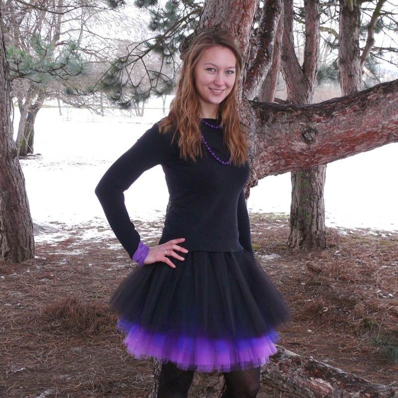 Sukně je ušitá z několika vrstev nařaseného tylu ve třech barvách (černá a dva odstíny fialové), podšitá je černou látkou, která však pod vrstvou tylu není téměř patrná, takže sukně vytváří dojem, jakoby byla celá jen z lehounkého tylu. Sukně je pečlivě ušitá, vrstvu po vrstvě. Důraz kladu na zapošití každé nitky a kvalitně provedenou práci. V žádném případě se nejedná jen o navázané kusy tylu na gumu!