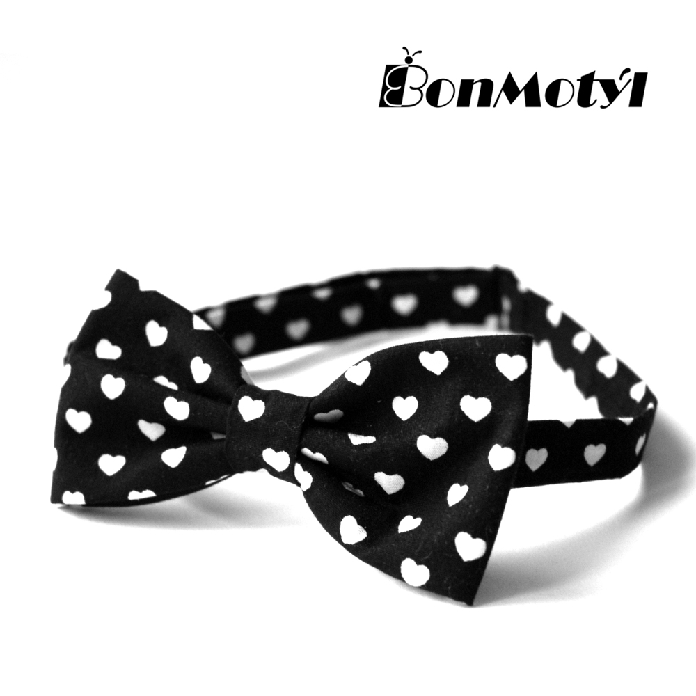 Pánský motýlek je ušitý z bavlněné látky - černá s drobnými bílými srdíčky.