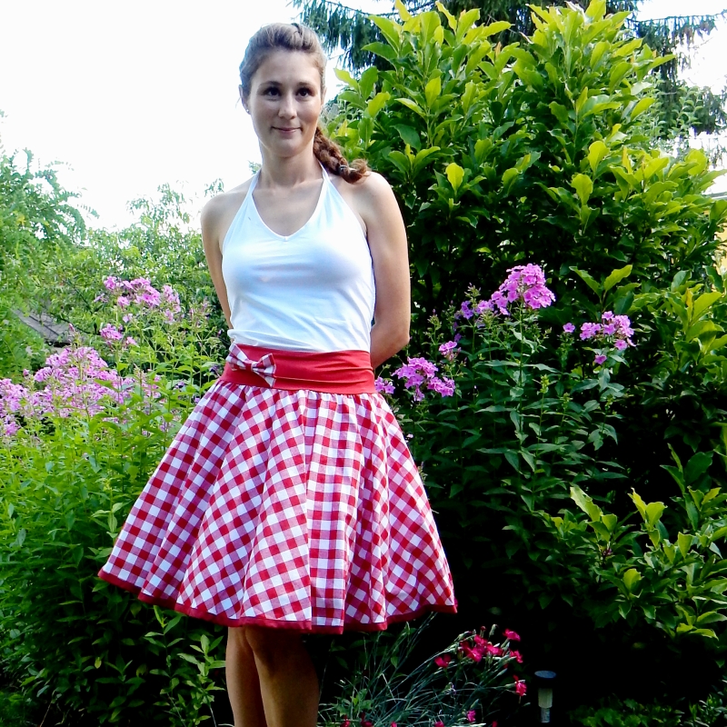 Sukně je ušitá z bavlněné kostkované látky. Je kolová a má červený pružný pasový límec, který se dobře přizpůsobí a je velmi pohodlný. Spodní okraj je červeně olemovaný.
