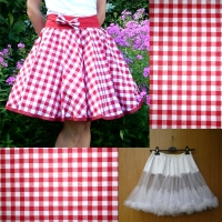 Sukně je ušitá z bavlněné kostkované látky. Je kolová a má červený pružný pasový límec, který se dobře přizpůsobí a je velmi pohodlný. Spodní okraj je červeně olemovaný.