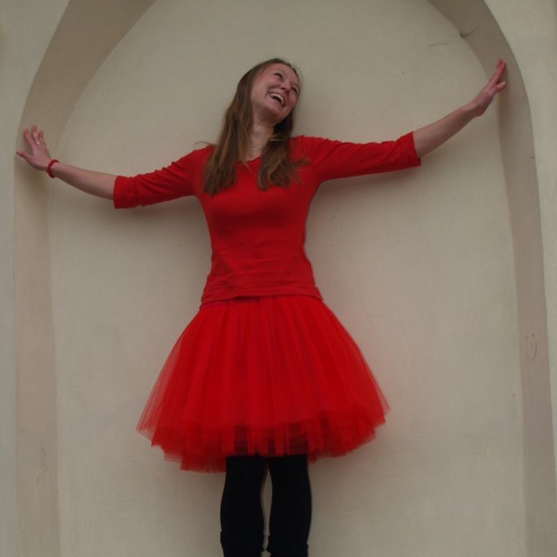 Sukně je ušitá z několika vrstev nařaseného červeného tylu, podšitá je červenou látkou, která však pod vrstvou tylu není patrná, takže sukně vytváří dojem, jakoby byla celá jen z lehounkého tylu. Sukně je pečlivě ušitá, vrstvu po vrstvě. Důraz kladu na zapošití každé nitky a kvalitně provedenou práci. V žádném případě se nejedná jen o navázané kusy tylu na gumu!
