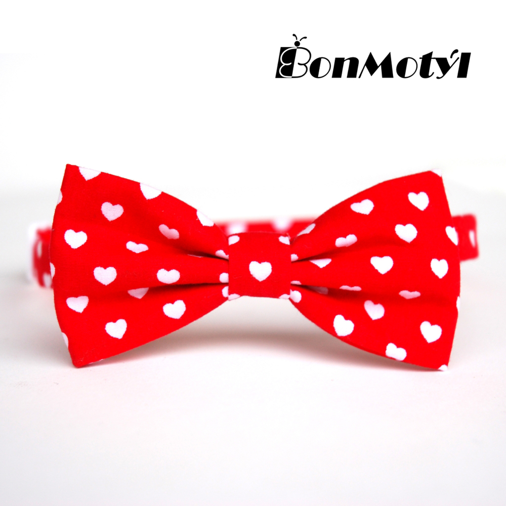 Pánský motýlek je ušitý z bavlněné látky - červená s drobnými bílými srdíčky.