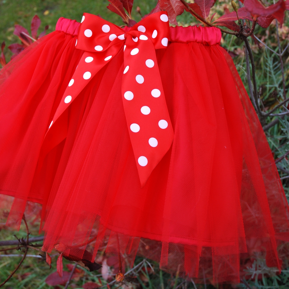 Sukně je ušitá z několika vrstev nařaseného červeného tylu, podšitá je stejně barevnou látkou, která však pod vrstvou tylu není téměř patrná, takže sukně vytváří dojem, jakoby byla celá jen z lehounkého tylu a zároveň není průhledná. Tyl i podšívka jsou všité do pasového límce, který má v sobě gumu, takže sukně je velikostně velmi přizpůsobivá. Na pasovém límci je velká puntíkovaná mašle. Sukně na fotografii má následující míry: Výška pasového límce: cca 2,5 cm Délka tylové části: cca 27 cm Minimální obvod v pase (aby sukně nepadala): 46 cm Maximální obvod přes boky (aby bylo ožné sukni obléknout): 95 cm