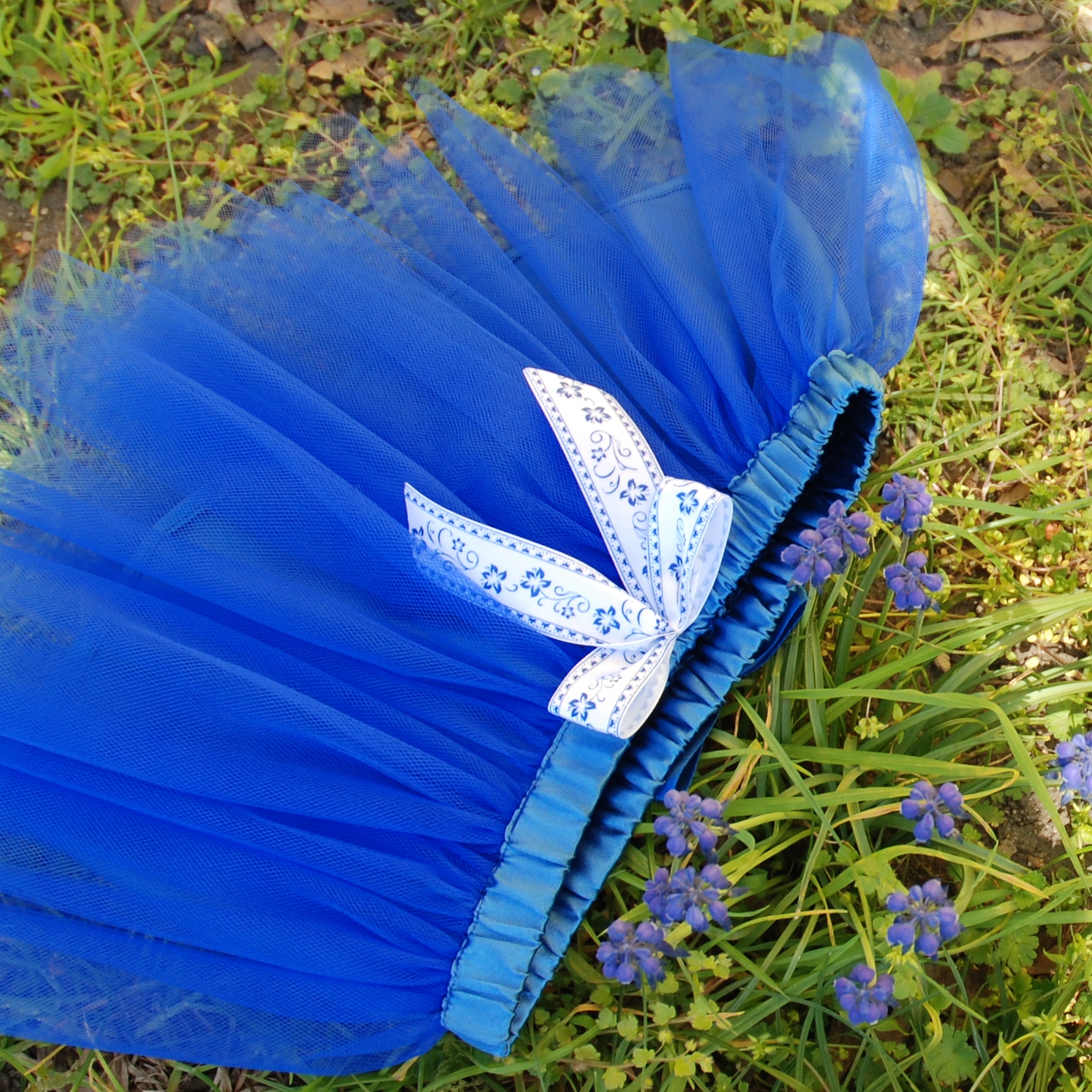 Sukně je ušitá z několika vrstev nařaseného královsky modrého tylu, podšitá je stejně barevnou látkou, která však pod vrstvou tylu není téměř patrná, takže sukně vytváří dojem, jakoby byla celá jen z lehounkého tylu a zároveň není průhledná. Tyl i podšívka jsou všité do pasového límce, který má v sobě gumu, takže sukně je velikostně velmi přizpůsobivá. Na pasovém límci je bílá mašle s lidovým motivem květin. Sukně na fotografii má následující míry: Výška pasového límce: cca 2,5 cm Délka tylové části: cca 26 cm Minimální obvod v pase (aby sukně nepadala): 45 cm Maximální obvod přes boky (aby bylo ožné sukni obléknout): 75 cm