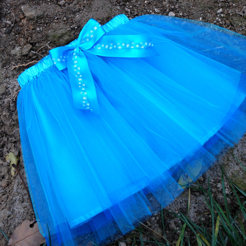 Sukně je ušitá z několika vrstev nařaseného tyrkysového a modrého tylu, podšitá je tyrkysovou látkou, která však pod vrstvou tylu není téměř patrná, takže sukně vytváří dojem, jakoby byla celá jen z lehounkého tylu a zároveň není průhledná. Tyl i podšívka jsou všité do pasového límce, který má v sobě gumu, takže sukně je velikostně velmi přizpůsobivá. Na pasovém límci je mašle s motivem vloček. Sukně na fotografii má následující míry: Výška pasového límce: cca 2,5 cm Délka tylové části: cca 30 cm Minimální obvod v pase (aby sukně nepadala): 52 cm Maximální obvod přes boky (aby bylo ožné sukni obléknout): 95 cm