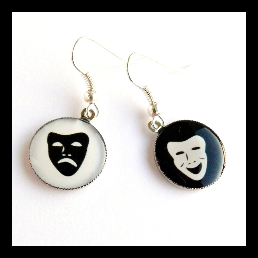 Náušnice s motivem divadelních masek mají průměr 1,5 cm. Každá náušnice je jiná, jedna černá, druhá bílá, jedna s veselou maskou, druhá se smutnou.