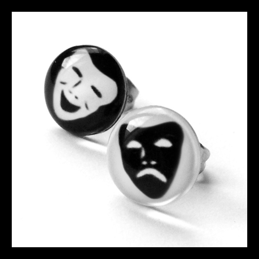 Drobné náušničky s motivem divadelních masek mají průměr 1 cm. Každá náušnice je jiná, jedna černá, druhá bílá, jedna s veselou maskou, druhá se smutnou. Motiv je zalitý dostatečnou vrstvou kvalitní křišťálové pryskyřice, která vytváří pravidelný kopeček. Je průzračná, lesklá a samozřejmě bez bublinek a nečistot.