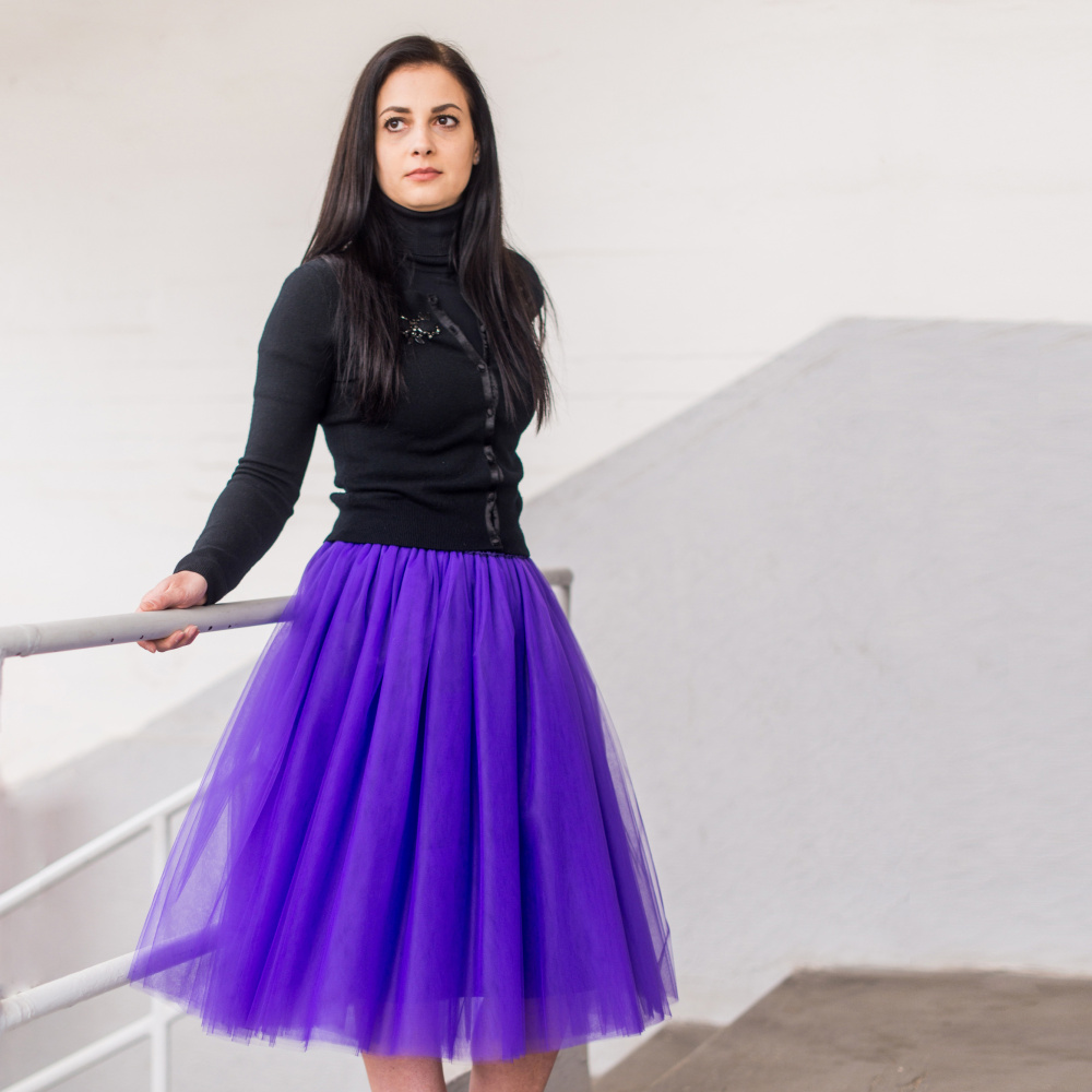 Sukně je ušitá z mnoha vrstev nařaseného fialového tylu, podšitá je fialovou látkou, která však pod vrstvou tylu není vůbec patrná, takže sukně vytváří dojem, jakoby byla celá jen z lehounkého tylu. Sukně je pečlivě ušitá, vrstvu po vrstvě. Důraz kladu na zapošití každé nitky a kvalitně provedenou práci. V žádném případě se nejedná jen o navázané kusy tylu na gumu!