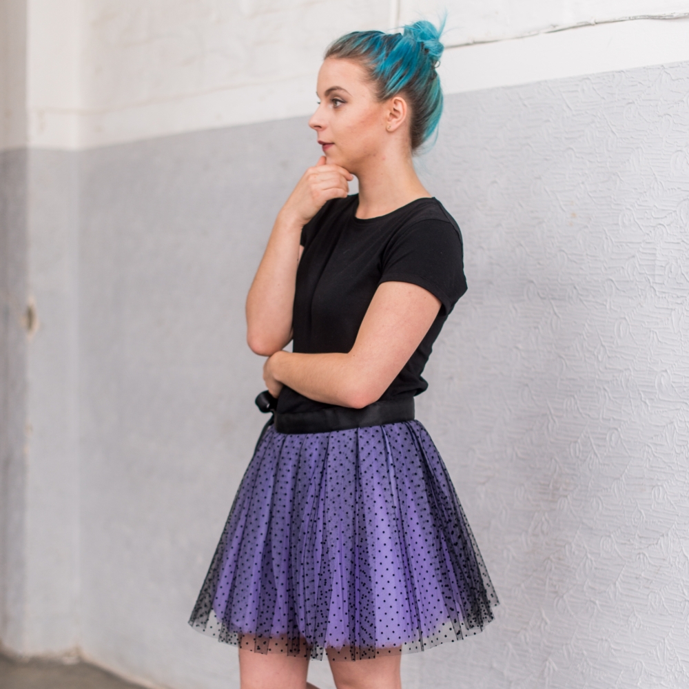 Sukně je ušitá z několika vrstev nařaseného fialového tylu, horní vrstva je černá s puntíky. Sukně je podšitá je fialovou látkou, která však pod vrstvou tylu není patrná, takže sukně vytváří dojem, jakoby byla celá jen z lehounkého tylu. Sukně je pečlivě ušitá, vrstvu po vrstvě. Důraz kladu na zapošití každé nitky a kvalitně provedenou práci. V žádném případě se nejedná jen o navázané kusy tylu na gumu!