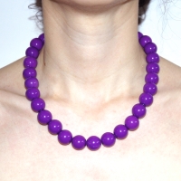 Fialové korále v retro stylu o průměu 1,5 cm jsou navlečené na gumičce. Náhrdelník má v klidu délku 54 cm a díky své pružnosti se dá snadno navléci na krk.