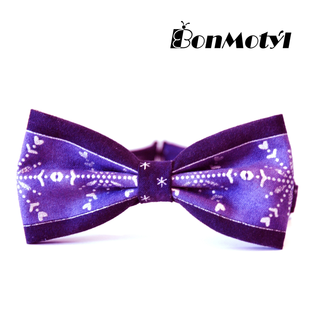 Pánský motýlek je ušitý z bavlněné látky - okraje jsou tmavě fialové, střed je světlěji fialový a zdobený stříbrnými hvězdičkami.