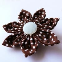 Kytka je veliká cca 7 cm je vyrobená z hnědé bavlněné látky s bílými puntíky, střed je bílý, lehce perleťový. Květina je hezky pravidelná, všechny lístky má stejně veliké a stejně nařasené, ušitá a slepená je pevně, takže něco vydrží. Ze zadní strany má pevně přišitý brožový můstek.