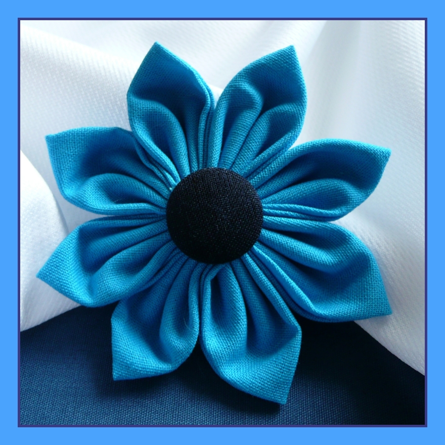 Kytka je veliká cca 8 cm, je vyrobená z modré bavlněné látky, střed je tmavší látkový knoflík. Květina je hezky pravidelná, všechny lístky má stejně veliké a stejně nařasené, ušitá a slepená je pevně, takže něco vydrží. Na zadní straně je pevně přišitý brožový můstek.