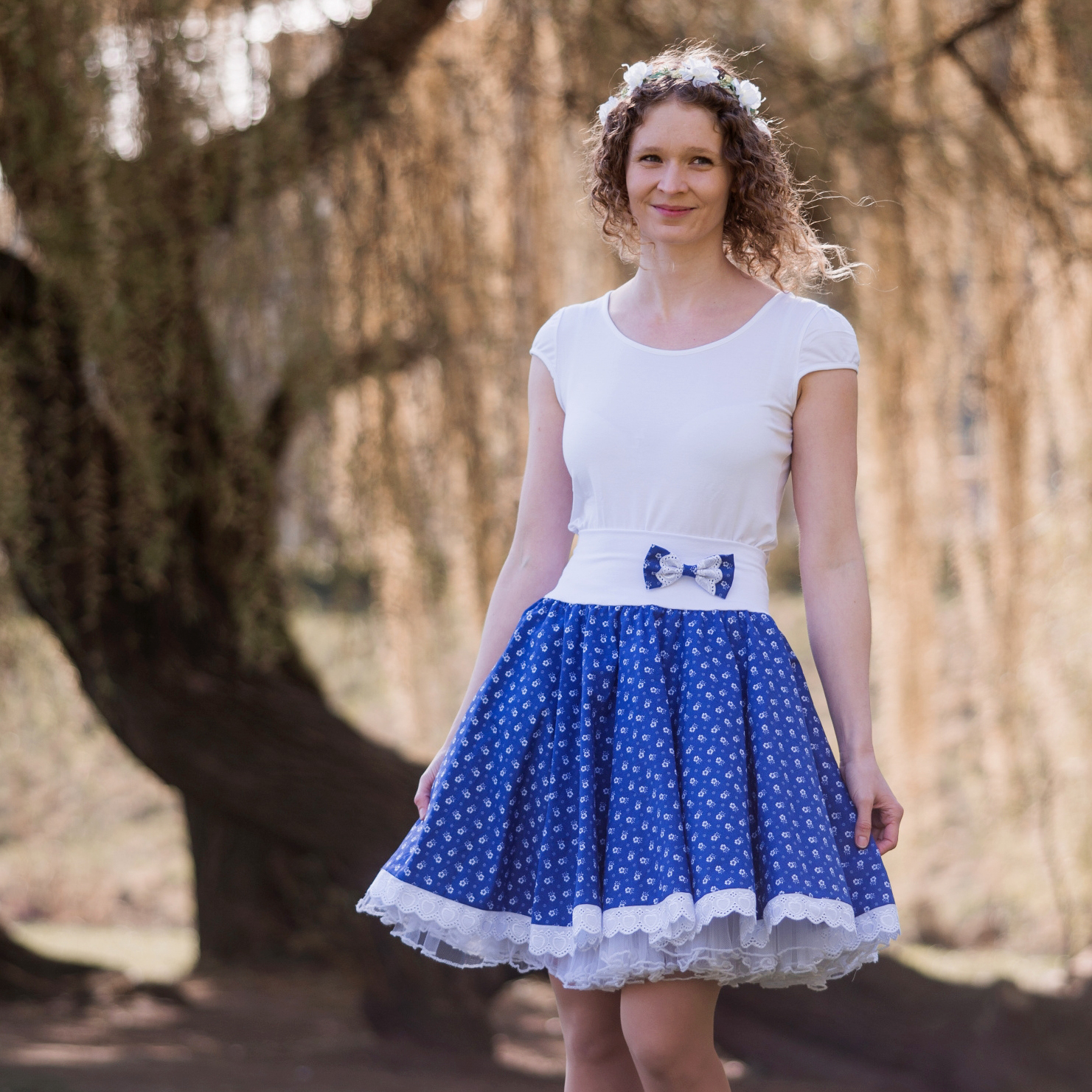 Sukně je ušitá z bavlněné látky imitující modrotisk - tmavě modrý podklad a bílé kytičky. Je kolová a má bílý pružný pasový límec, který se dobře přizpůsobí a je velmi pohodlný. Spodní okraj je olemovaný bílou krajkou.