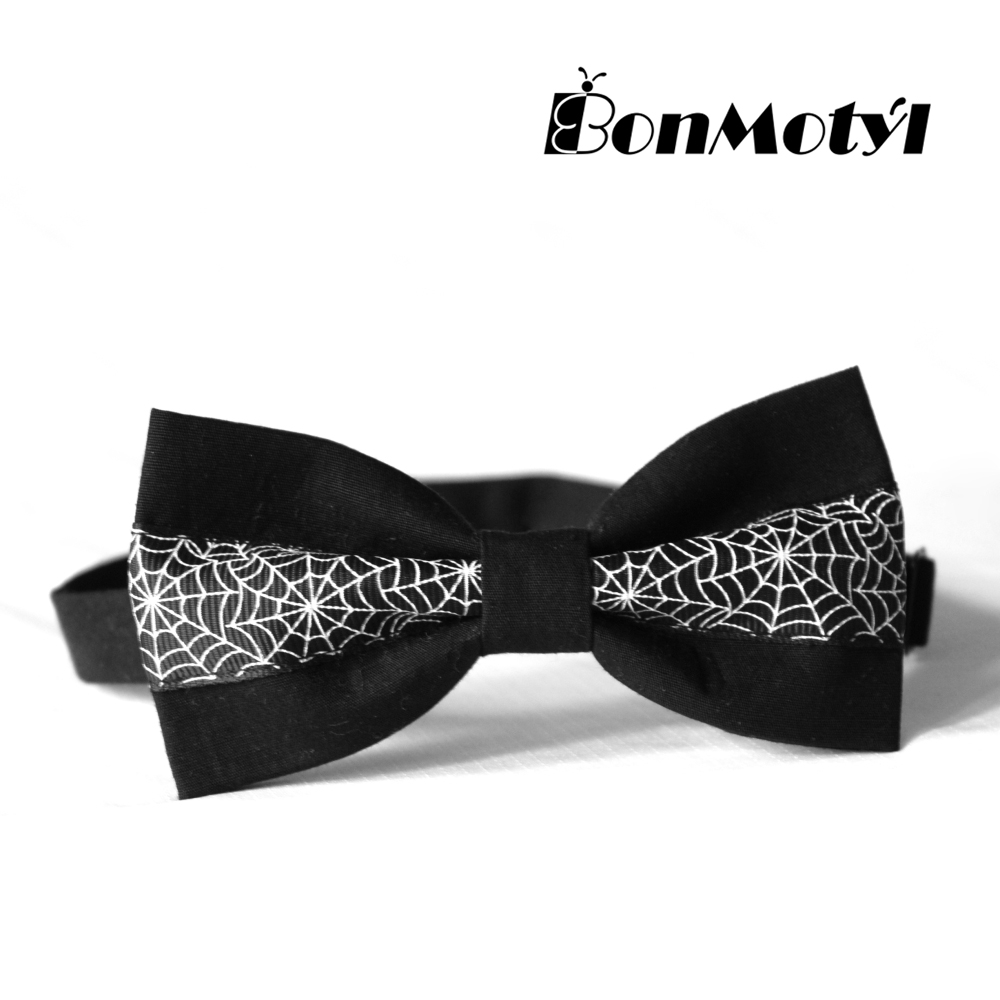 Pánský motýlek je ušitý z černé bavlněné látky, zbobený je páskem s bílou pavučinou.