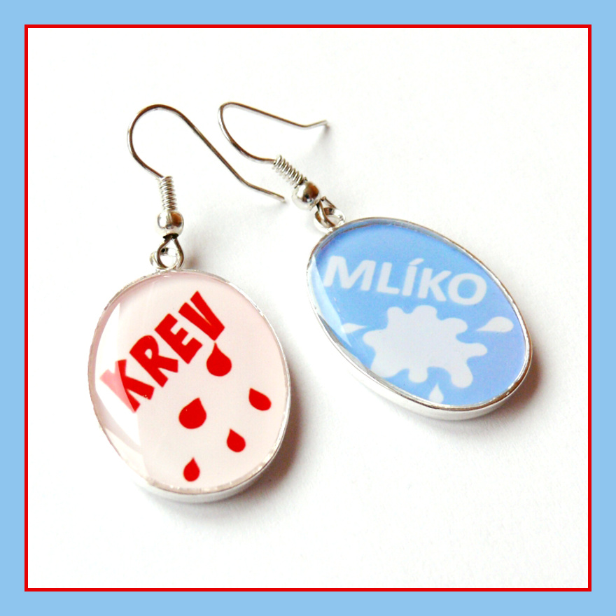 Náušnice s motivem dle vlastního návrhu mají oválný tvar. Ovál je velký cca 1,5 x 1,8 cm. Motiv nápisu "KREV" a "MLÍKO" je zalitý dostatečnou vrstvou kvalitní křišťálové pryskyřice, která vytváří pravidelný kopeček. Je průzračná, lesklá a samozřejmě bez bublinek a nečistot.
