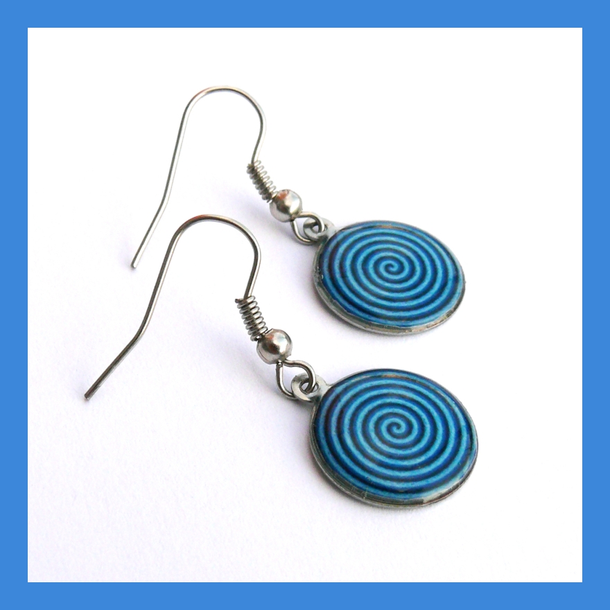 Visací náušnice mají průměr lůžka 1,5 cm. Použito je rovné lůžko bez zvednutého okraje. Motiv modrých soustředných kružnic je zalitý dostatečnou vrstvou kvalitní křišťálové pryskyřice, která vytváří pravidelný kopeček. Je průzračná, lesklá a samozřejmě bez bublinek a nečistot.