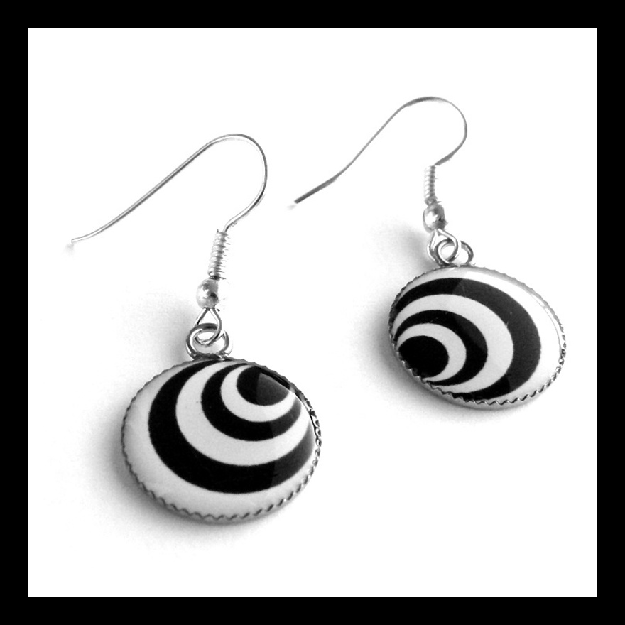 Náušnice s motivem černobílých koleček mají průměr 1,5 cm. Každá náušnice má kolečka jinak pootočená.