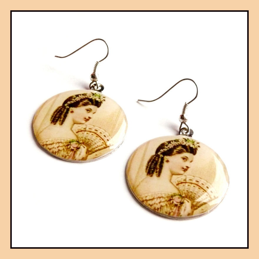 Náušnice s motivem z módní ilustrace z období druhého rokoka (cca 1850-1870) mají průměr 2,5 cm. Motiv je zalitý na lůžku bez okraje dostatečnou vrstvou kvalitní křišťálové pryskyřice, která vytváří pravidelný kopeček. Je průzračná, lesklá a samozřejmě bez bublinek a nečistot.
