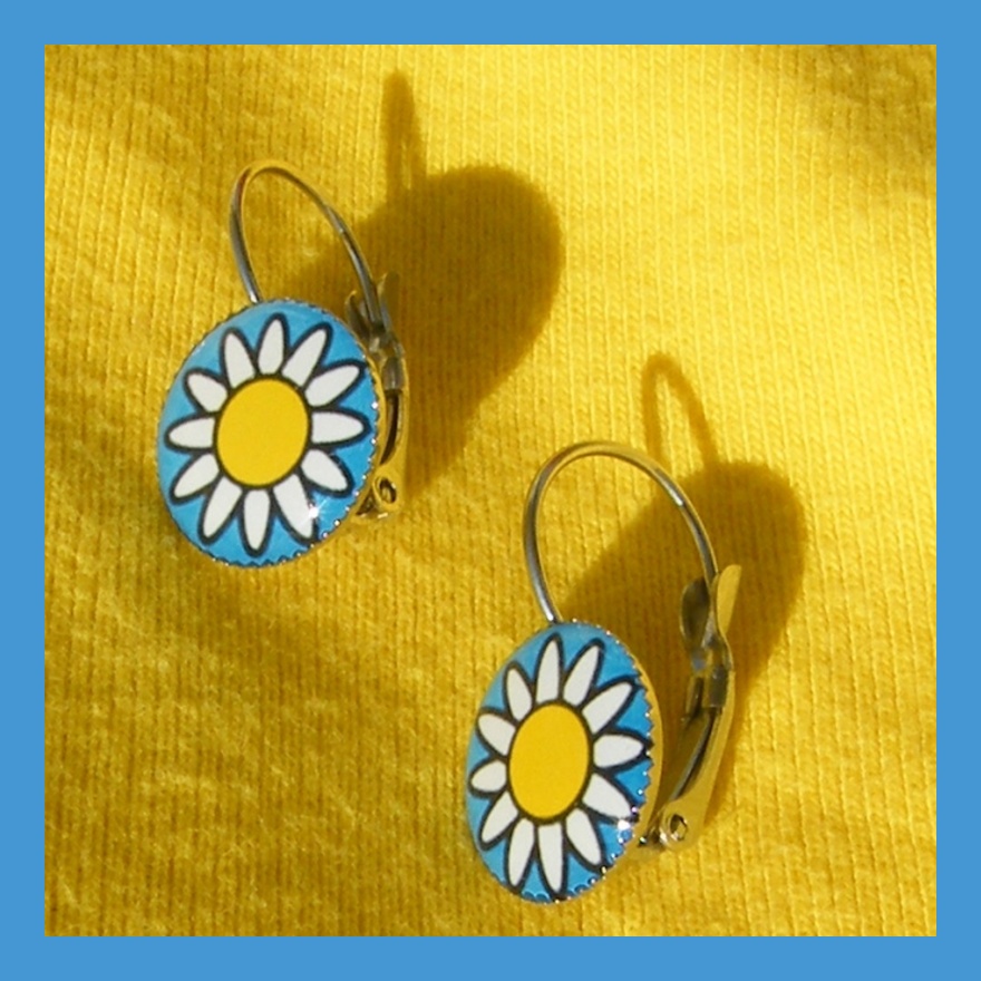 Visací, zapínací náušnice s motivem kopretiny na modrém pozadí mají průměr lůžka 1,2 cm. Motiv je zalitý dostatečnou vrstvou kvalitní křišťálové pryskyřice, která vytváří pravidelný kopeček. Je průzračná, lesklá a samozřejmě bez bublinek a nečistot.