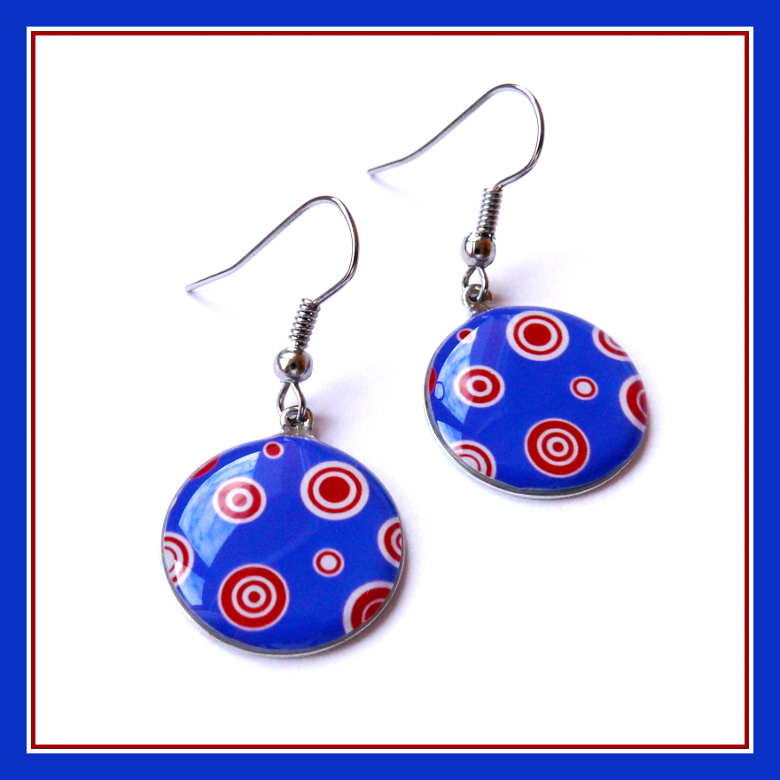 Náušnice mají průměr 1,8 cm. Motiv modro-červeno-bílých kruhů je zalitý dostatečnou vrstvou kvalitní křišťálové pryskyřice, která vytváří pravidelný kopeček. Je průzračná, lesklá a samozřejmě bez bublinek a nečistot.
