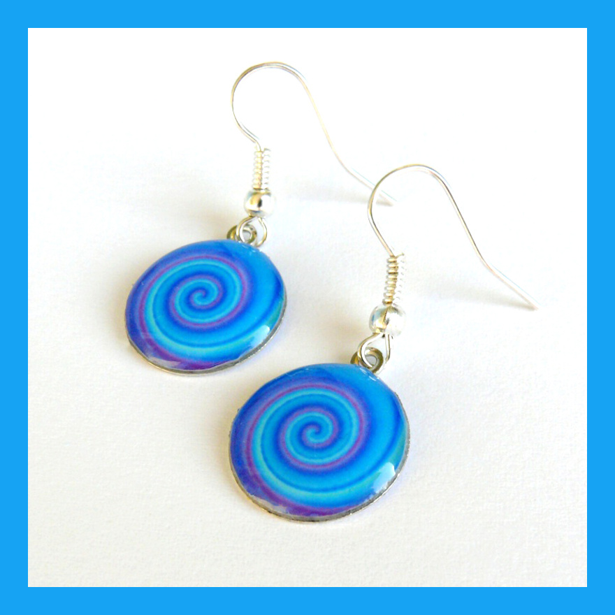 Visací náušnice mají průměr lůžka 1,5 cm. Motiv modro-fialové spirály dle vlastního návrhu je zalitý dostatečnou vrstvou kvalitní křišťálové pryskyřice, která vytváří pravidelný kopeček. Je průzračná, lesklá a samozřejmě bez bublinek a nečistot.