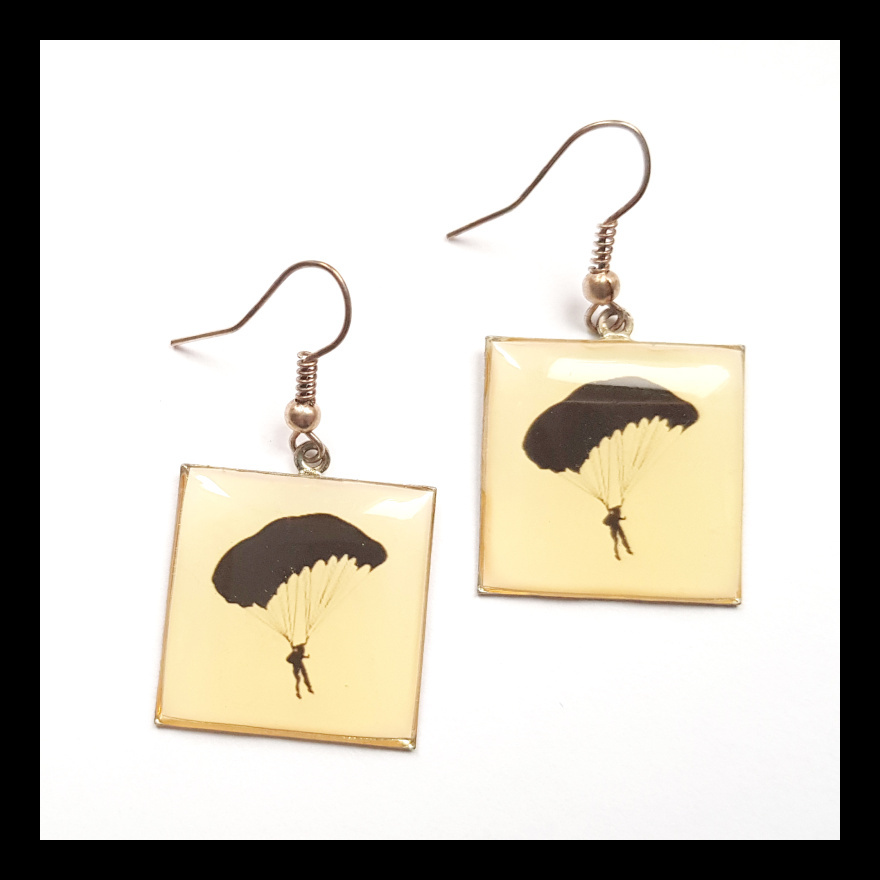 Náušnice čtvercového tvaru mají rozměr 2,3 x 2,3 cm. Motiv parašutisty je zalitý dostatečnou vrstvou kvalitní křišťálové pryskyřice, která vytváří pravidelný kopeček. Je průzračná, lesklá a samozřejmě bez bublinek a nečistot.