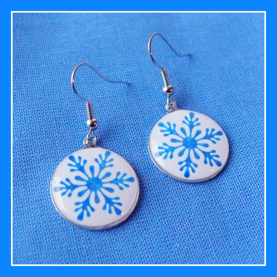 Náušnice mají průměr 1,8 cm. Motiv modré vločky na bílém pozadí je zalitý dostatečnou vrstvou kvalitní křišťálové pryskyřice, která vytváří pravidelný kopeček. Je průzračná, lesklá a samozřejmě bez bublinek a nečistot.