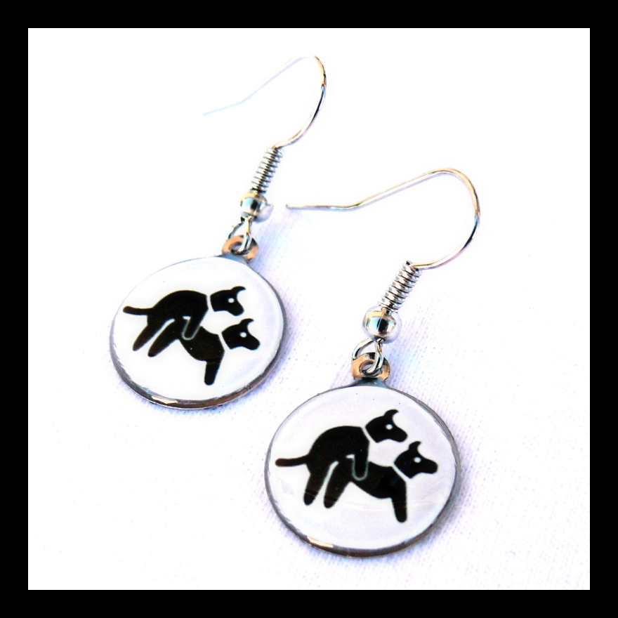 Náušnice mají průměr 1,5 cm. Motiv sprostých pejsků na bílém pozadí je zalitý dostatečnou vrstvou kvalitní křišťálové pryskyřice, která vytváří pravidelný kopeček. Je průzračná, lesklá a samozřejmě bez bublinek a nečistot.