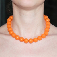 Oranžové korále v retro stylu o průměu 1,5 cm jsou navlečené na gumičce. Náhrdelník má v klidu délku 48 cm a díky své pružnosti se dá snadno navléci na krk.