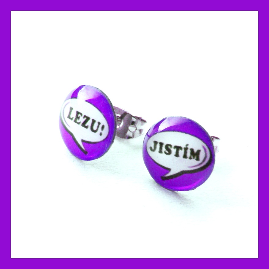 Drobné náušničky mají průměr 1 cm. Každá náušnice je jiná, jedna má na sobě nápis v bublině "JISTÍM", druhá "LEZU". Motiv je zalitý dostatečnou vrstvou kvalitní křišťálové pryskyřice, která vytváří pravidelný kopeček. Je průzračná, lesklá a samozřejmě bez bublinek a nečistot.