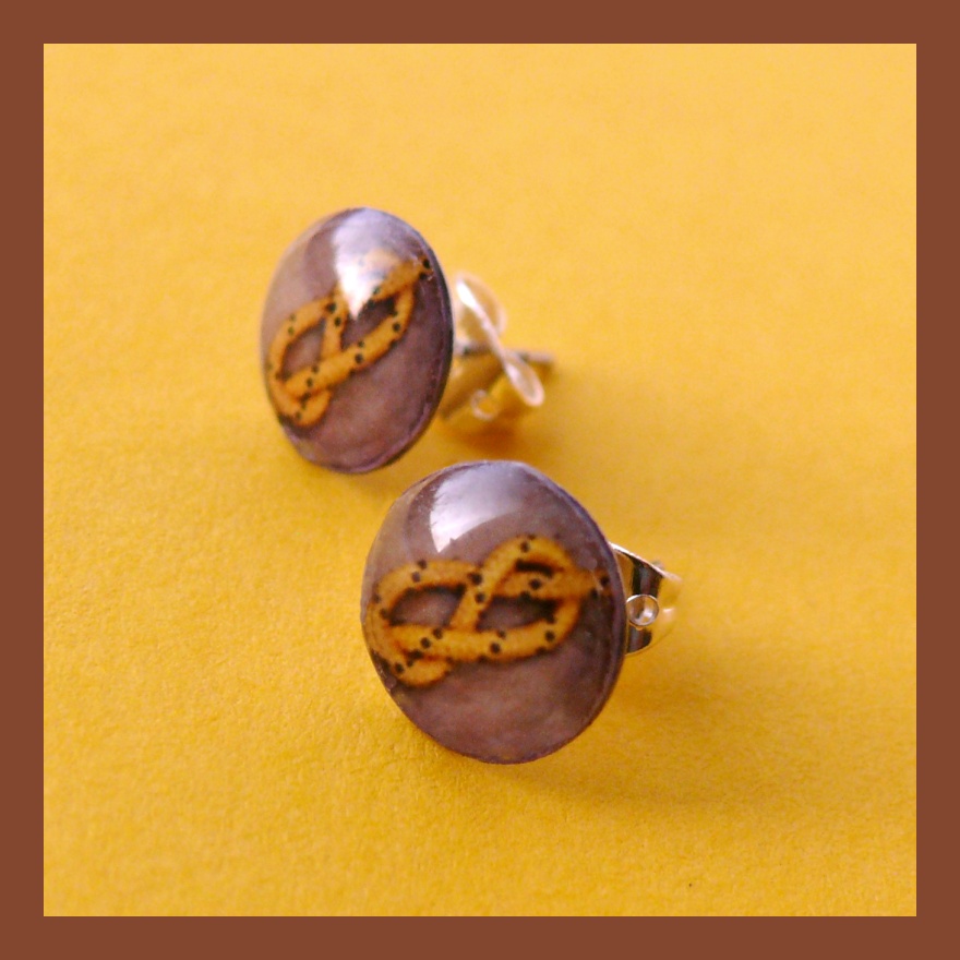 Drobné náušničky mají průměr 1 cm. Motiv osmy uvázané na horolezeckém laně je zalitý dostatečnou vrstvou kvalitní křišťálové pryskyřice, která vytváří pravidelný kopeček. Je průzračná, lesklá a samozřejmě bez bublinek a nečistot.