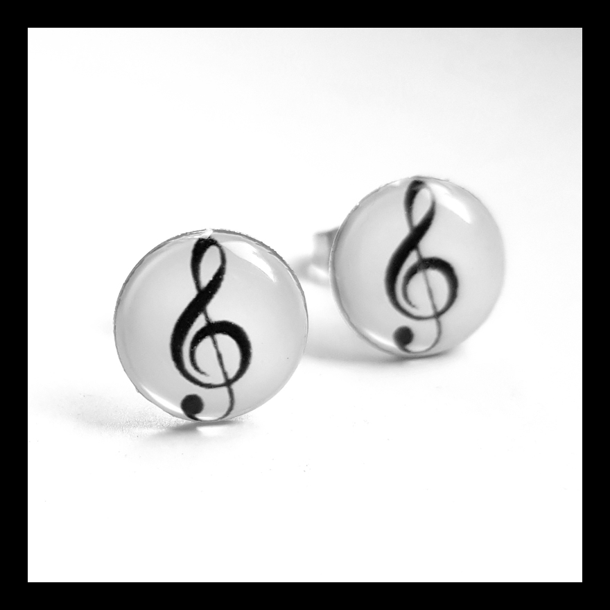 Drobné náušničky mají průměr 1 cm. Motiv houslového klíče je zalitý dostatečnou vrstvou kvalitní křišťálové pryskyřice, která vytváří pravidelný kopeček. Je průzračná, lesklá a samozřejmě bez bublinek a nečistot.