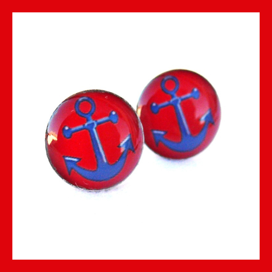 Drobné náušničky mají průměr 1 cm. Motiv modré kotvy na červeném pozadí je zalitý dostatečnou vrstvou kvalitní křišťálové pryskyřice, která vytváří pravidelný kopeček. Je průzračná, lesklá a samozřejmě bez bublinek a nečistot.