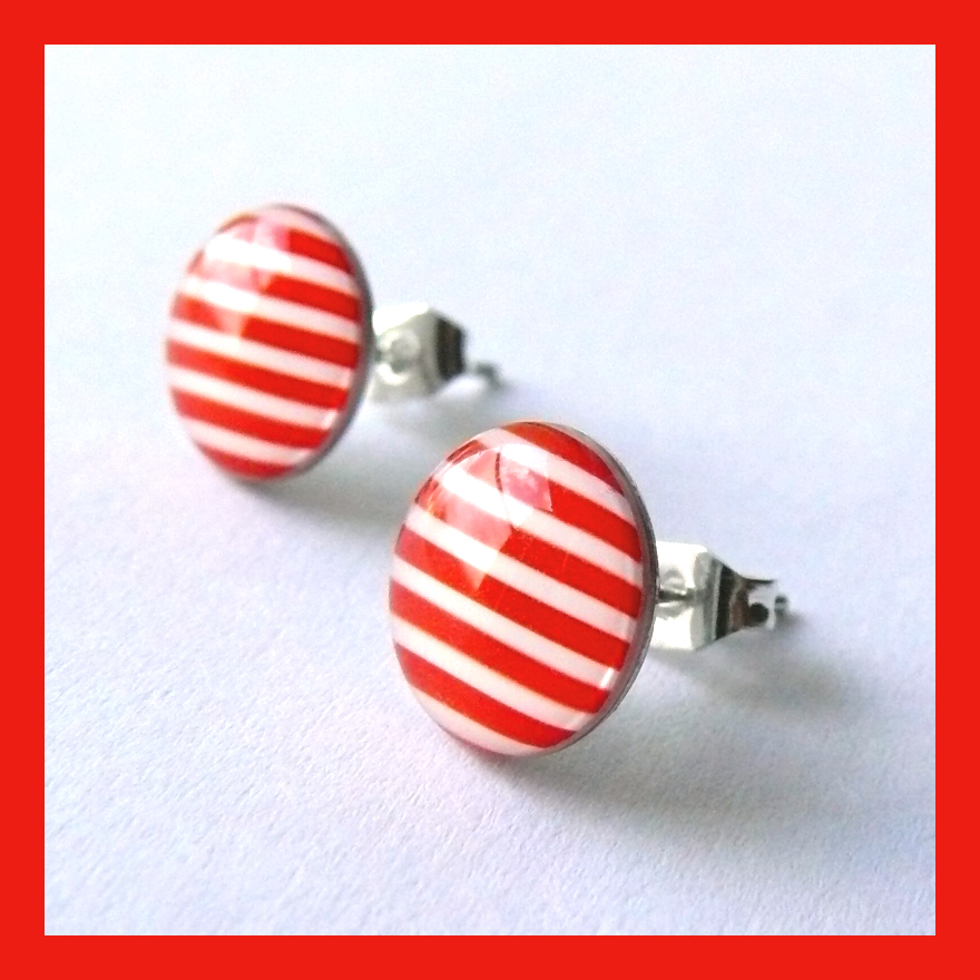 Drobné náušničky mají průměr 1 cm. Motiv červeno-bílých proužků je zalitý dostatečnou vrstvou kvalitní křišťálové pryskyřice, která vytváří pravidelný kopeček. Je průzračná, lesklá a samozřejmě bez bublinek a nečistot.