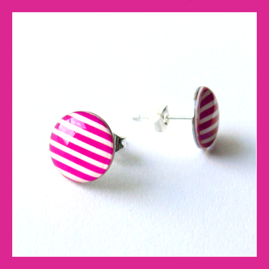 Pruhované růžovo-bílé náušničky mají průměr 1 cm. Motiv dle vlastního návrhu je zalitý dostatečnou vrstvou kvalitní křišťálové pryskyřice, která vytváří pravidelný kopeček. Je průzračná, lesklá a samozřejmě bez bublinek a nečistot.