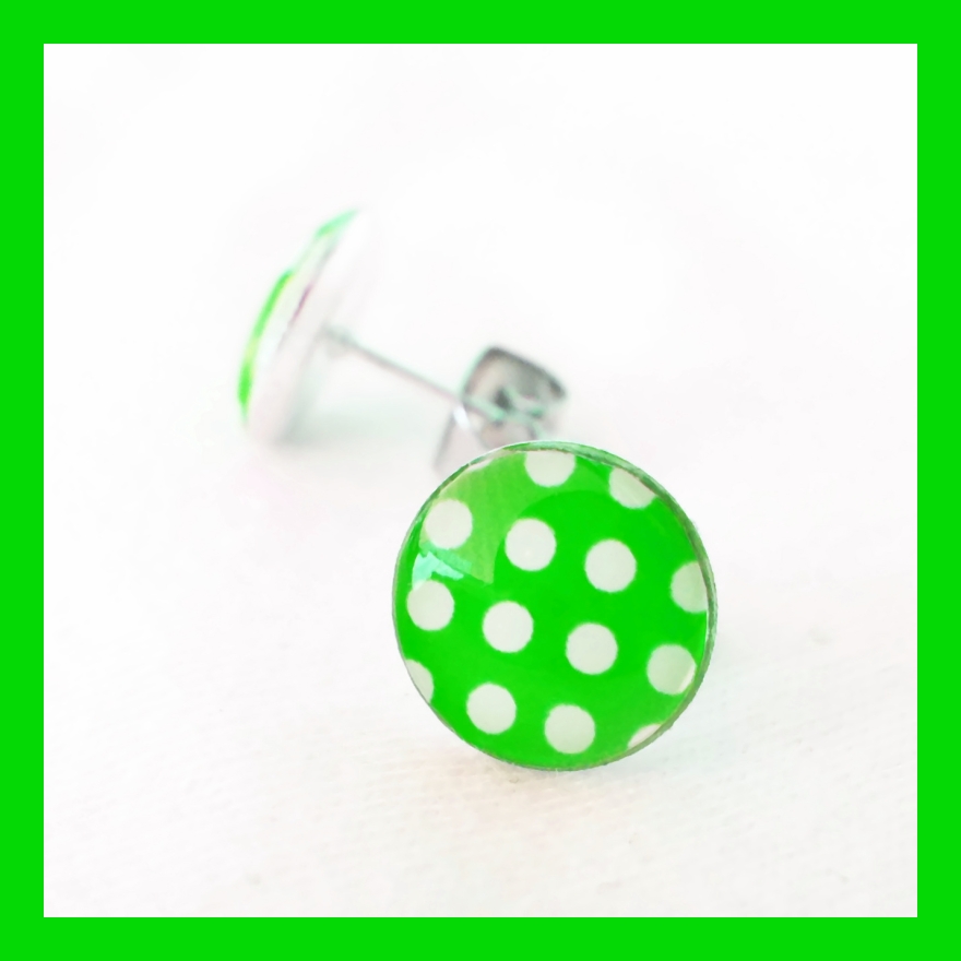 Puntíkované zeleno-bílé náušničky mají průměr 1 cm. Motiv dle vlastního návrhu je zalitý dostatečnou vrstvou kvalitní křišťálové pryskyřice, která vytváří pravidelný kopeček. Je průzračná, lesklá a samozřejmě bez bublinek a nečistot.