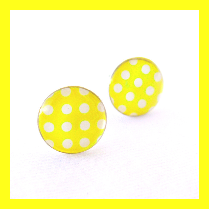 Puntíkované žluto-bílé náušničky mají průměr 1 cm. Motiv dle vlastního návrhu je zalitý dostatečnou vrstvou kvalitní křišťálové pryskyřice, která vytváří pravidelný kopeček. Je průzračná, lesklá a samozřejmě bez bublinek a nečistot.