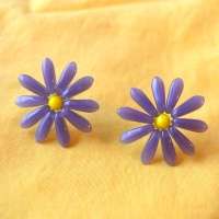 Náušnice ze skleněných korálků mají průměr 2,5 cm. Květinky mají fialové lístky a žlutý prostředek.