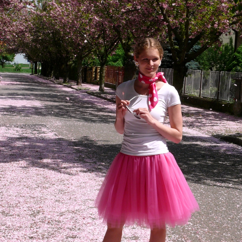 Sukně je ušitá z mnoha vrstev nařaseného jemného růžového tylu, podšitá je stejně barevnou látkou, která však pod vrstvou tylu není vůbec patrná, takže sukně vytváří dojem, jakoby byla celá jen z lehounkého tylu. Sukně je pečlivě ušitá, vrstvu po vrstvě. Důraz kladu na zapošití každé nitky a kvalitně provedenou práci. V žádném případě se nejedná jen o navázané kusy tylu na gumu!