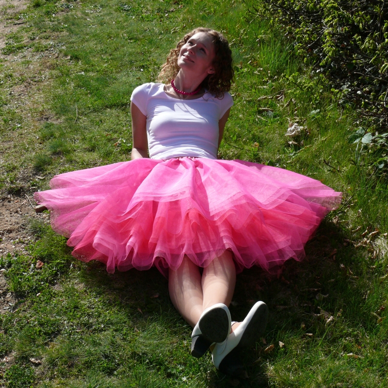 Sukně je ušitá z několika vrstev nařaseného sytě růžového tylu ve třech odstínech, podšitá je růžovou látkou, která však pod vrstvou tylu není patrná, takže sukně vytváří dojem, jakoby byla celá jen z lehounkého tylu. Sukně je pečlivě ušitá, vrstvu po vrstvě. Důraz kladu na zapošití každé nitky a kvalitně provedenou práci. V žádném případě se nejedná jen o navázané kusy tylu na gumu!