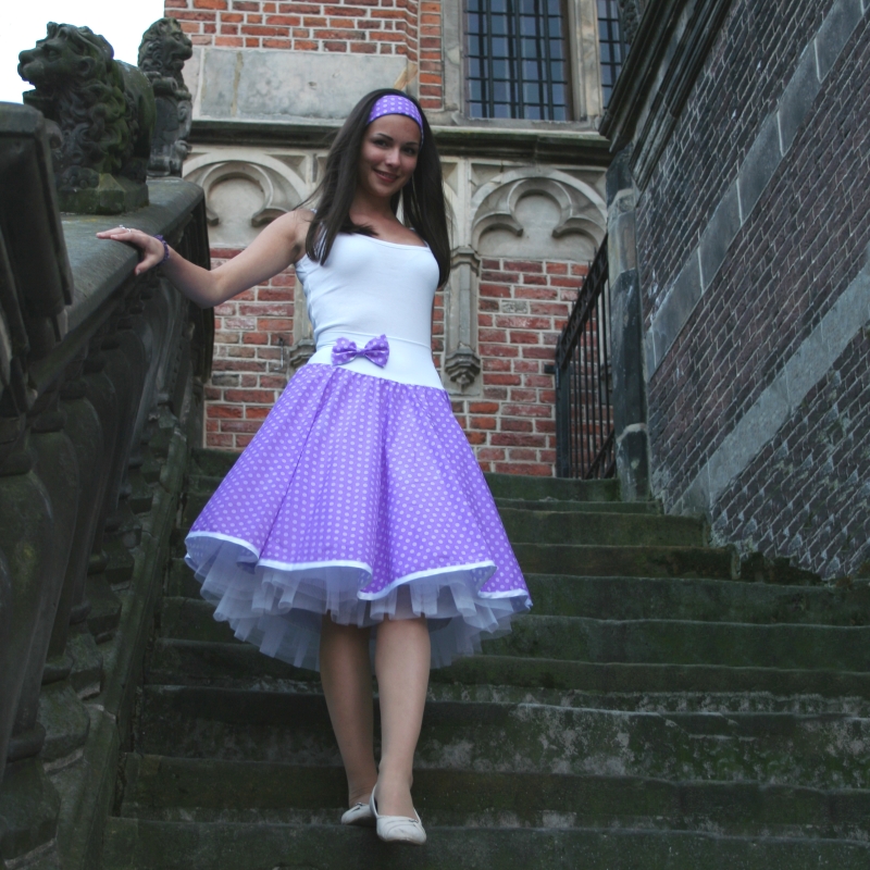 Sukně v retro stylu je ušitá z puntíkované bavlněné látky - světle fialový podklad a bílé puntíky o velikosti 1 cm. Je kolová a má bílý pružný pasový límec, který se dobře přizpůsobí a je velmi pohodlný. Spodní okraj je bíle olemovaný.