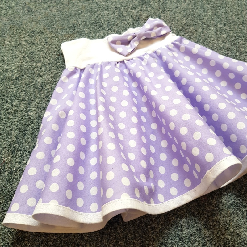 Sukně v retro stylu je ušitá z puntíkované bavlněné látky - světle fialový podklad a bílé puntíky o velikosti 1 cm. Je kolová a má bílý pružný pasový límec, který se dobře přizpůsobí a je velmi pohodlný. Spodní okraj je bíle olemovaný. K sukni navíc dostanete mašličku jako sponku do vlasů. Sukně má následující míry: Délka bavlněné části: cca 22 cm Šířka pasového límce: cca 6 cm Velikost mašle (brože): cca 8 cm Minimální obvod v místě pasového límce: 45 cm (jinak by sukně padala, větší obvod nevadí, pasový límec je hodně pružný) Maximální obvod přes boky: 61 cm (v případě většího obvodu by nebylo možné sukni obléknout) Odpovídá přibližně velikosti 92-110. K sukni je možné objednat také tylovou spodničku! |